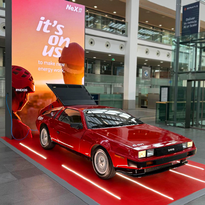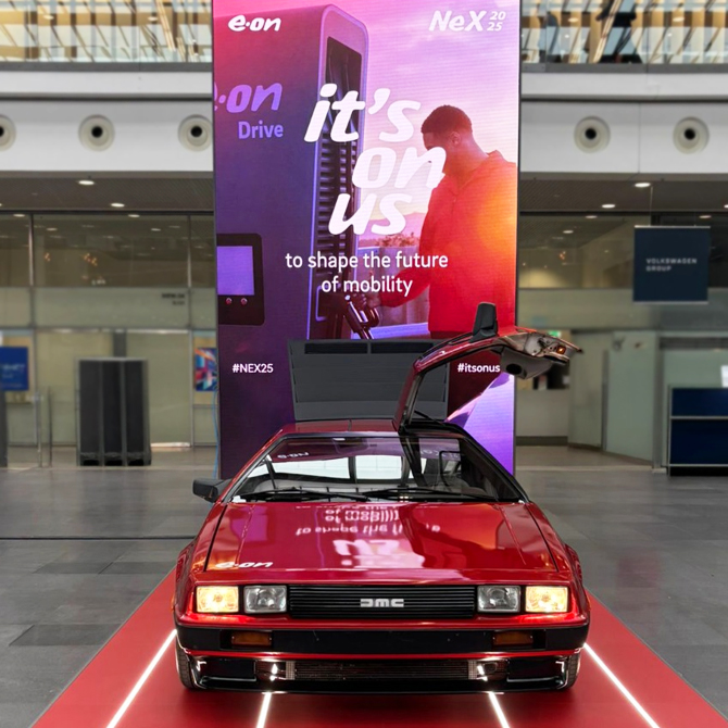 No, into it! E.ON has converted the DeLorean into an electric car.